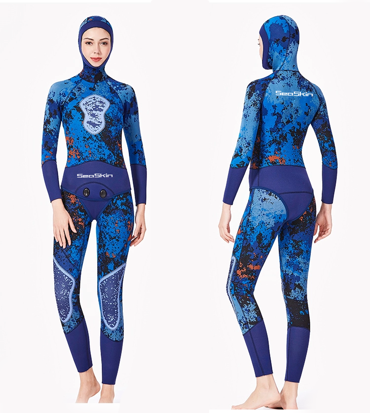 Seaskin Camo wetsuit are made of Jako neoprene which is a shining new star in European market and requtated by it’s good quality. It’s good flexibility and compression resistance make it more and more welcomed by European market. We leave the inner lining removed without any fabric laminated to create a better seal between the spearo and skin, which is called a open-celled lining, based on this we developed a special technology that a titanium coating over the open cell to make it more warmth and easy to wear on. Glued and blind-stitches seams are used so the seams doesn’t penetrate the rubber, which means no pin holes that may let the water get in, between the seams we will reinforced by glue to increase the durability and seal.